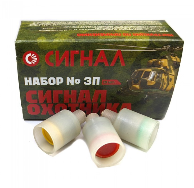 Набор сигнальных ракет "Сигнал охотника №3" в алюминиевой гильзе производства ФГУП "Сигнал" (Челябинск). Используется для подачи сигналов рыбаками, охотниками, туристами и спасателями. Может быть использован для отпугивания диких животных или просто для салюта в честь праздника :) В упаковке 15 ракет (по 5 ракет красного, зеленого и желтого цвета).